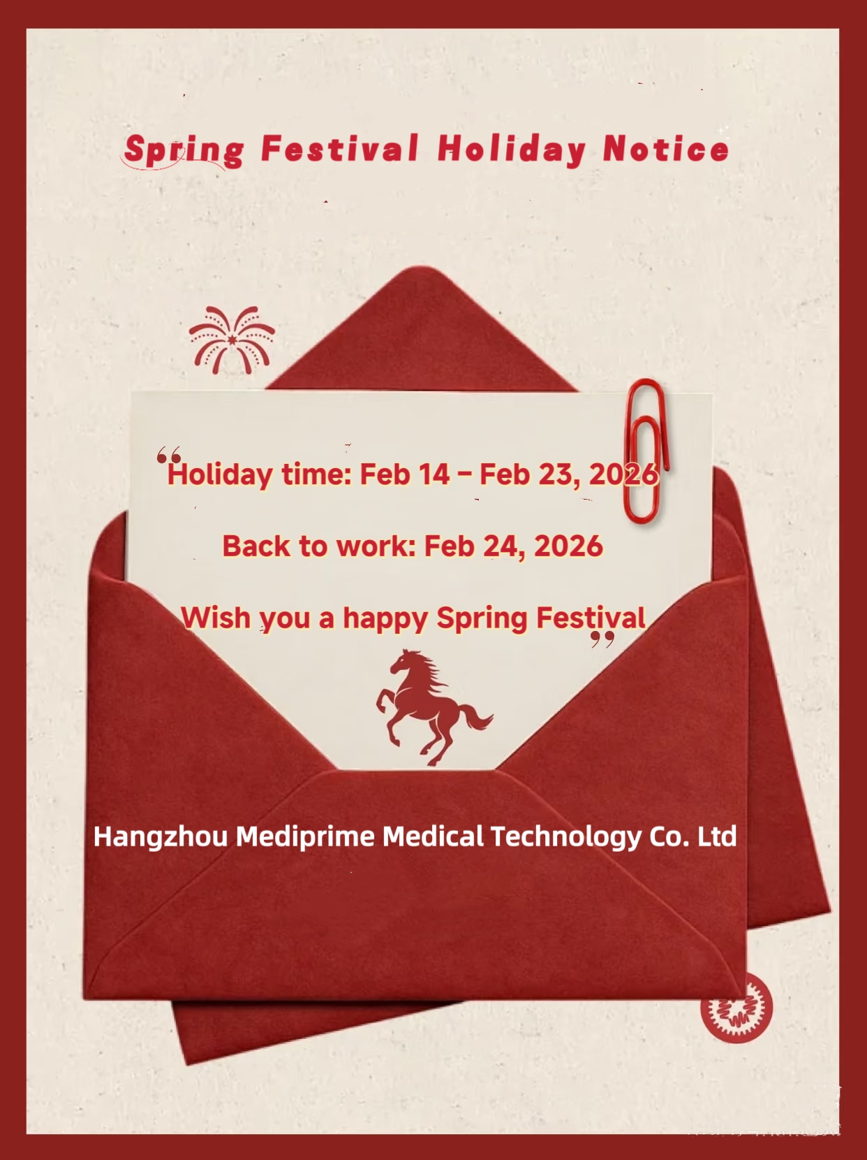 Dear partners,We will be on holiday from February 14 to February 23, 2026 for the Spring Festival.Our business and services will resume on February 24, 2026.During the holiday, replies may be delayed. We appreciate your understanding and wish you a prosperous New Year!